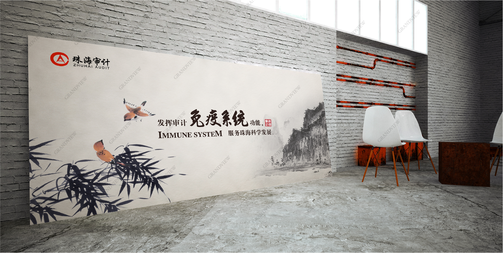 當看到一幅極具人文古韻的水墨畫時,為珠海市審計局與藝術聯結點苦苦尋覓無果的廣角設計師茅塞頓開。于是著力于對民族的審美意識和審美心理的把握,站在珠海市審計局的角度進行綜合設計。